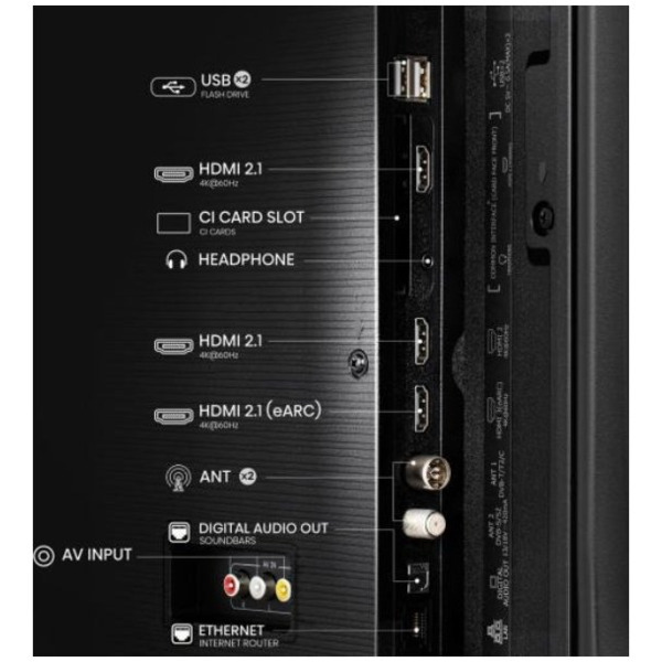 Povezivanje: 3 x HDMI 2.0 (jedan sa eARC podrškom), 2 x USB, Dual Band Wi-Fi, Bluetooth 5.0, LAN, CI+.